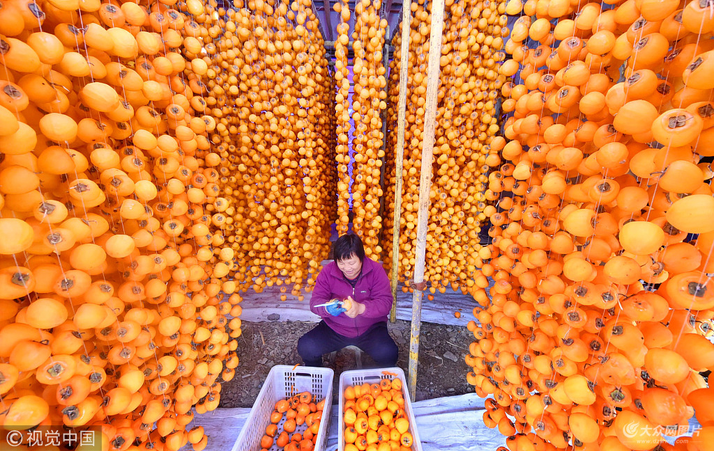 2018年10月23日,山東省淄博市沂源縣悅莊鎮(zhèn)陳家官莊村的農(nóng)民在將加工的柿子進行吊曬。