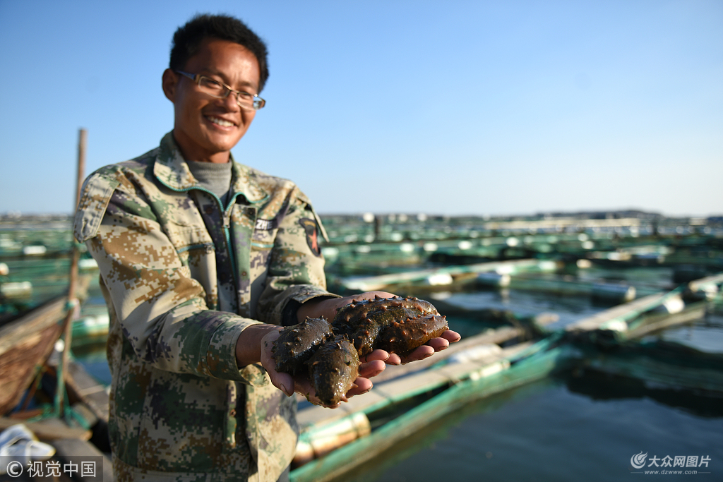 2018年11月1日,山東省榮成市石島管理區(qū)石島灣海域深海養(yǎng)殖區(qū),海參養(yǎng)殖戶在捕撈海參,并給網(wǎng)箱養(yǎng)殖的海參換網(wǎng)。