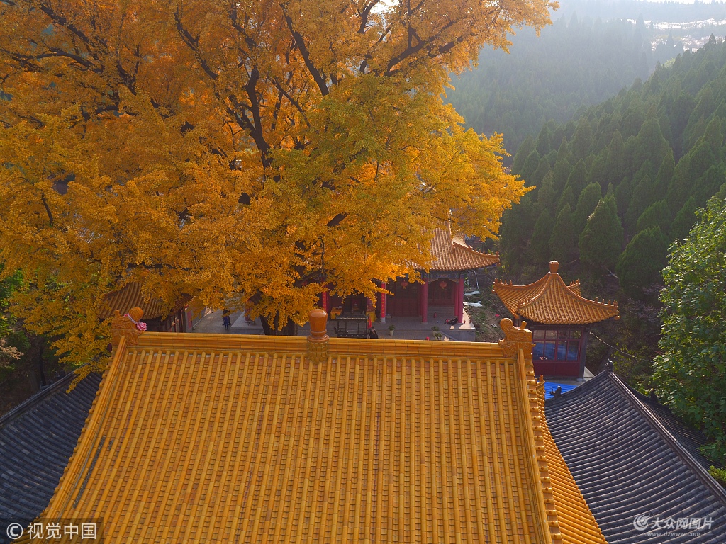 2018年11月2日,濟(jì)南,深秋的淌豆寺內(nèi)千年銀杏樹葉金黃,宛如披掛黃金甲,空中俯瞰與周邊綠色樹木相互輝映,猶如金鑲玉深藏山中,獨(dú)成一景。