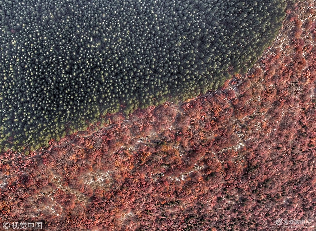 2018年11月3日,金秋時節(jié),位于山東省濟南市楔子山山脊一帶植被呈現(xiàn)出“平分秋色”的壯美景象:一側(cè)紅色一側(cè)綠色,令人稱奇,成為濟南秋天里網(wǎng)紅好去處。圖為無人機航拍濟南楔子山“雙色”植被。
