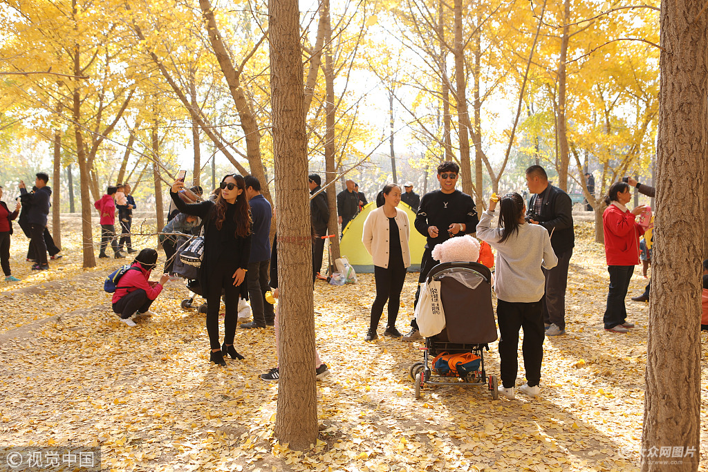 2018年11月3日,山東東營,城南銀杏林20萬株銀杏進(jìn)入黃金觀賞期,林區(qū)內(nèi)到處都是攢動(dòng)的人影,甚至還有人帶來了吊床和帳篷。