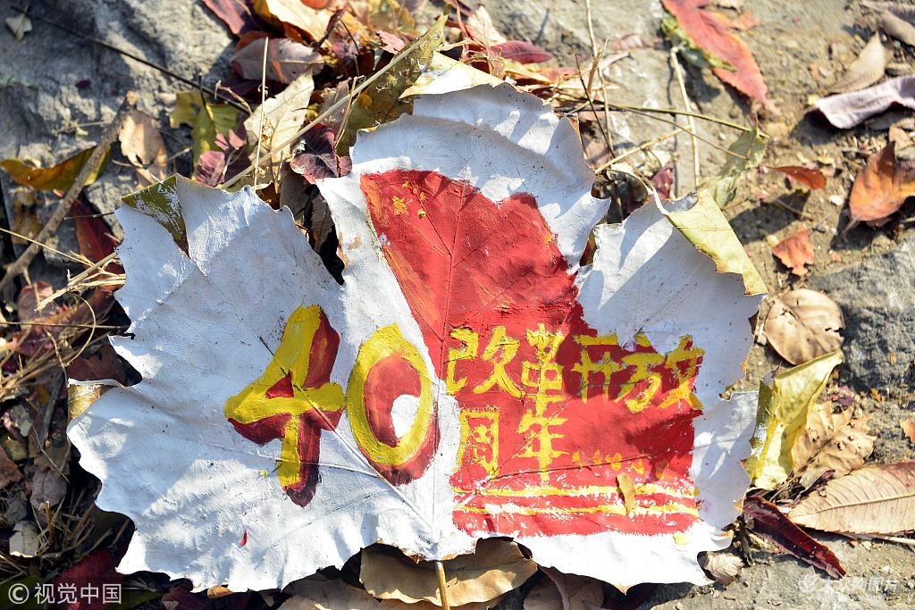 2018年11月3日,在山東聊城大學(xué)西校區(qū)季羨林湖畔,大學(xué)生在創(chuàng)作的涂鴉美容的樹葉,以紀(jì)念改革開放40周年。