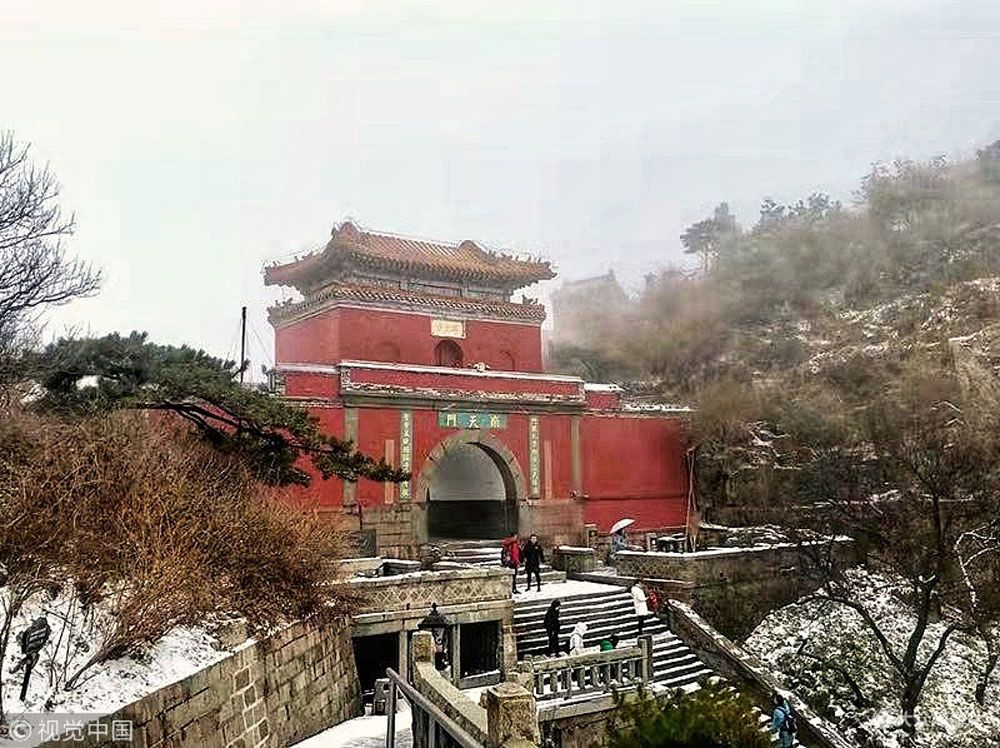 2018年11月7日,山東泰安,泰山景區(qū)迎來了入冬的第一場(chǎng)雪,清晨被雪覆蓋的南天門。