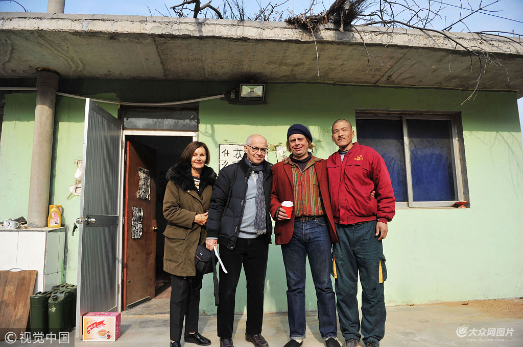 2018年11月25日,山東青島西海岸新區(qū),美國(guó)人戴嶺(右二)和他的房東與法國(guó)杜克羅斯夫婦在住所前合影。