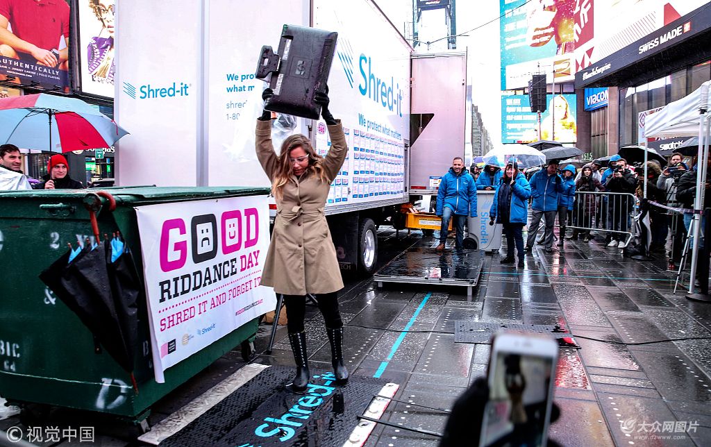 當?shù)貢r間2018年12月28日,美國紐約,新年前夕,時報廣場舉辦一年一度的“大解脫日”活動,公眾將2018年中不快樂的回憶寫在紙上扔進粉碎機中,并將載有不快樂記憶的物件砸壞,從而告別過去的一年,迎接新的一年。