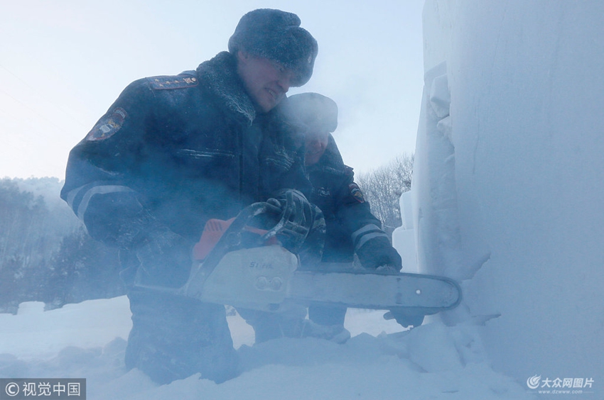 當(dāng)?shù)貢r間2018年12月29日,俄羅斯克拉斯諾雅茨克,俄羅斯交警參加一年一度城市“雪人游行”比賽,零下29攝氏度的氣溫下創(chuàng)作雪雕