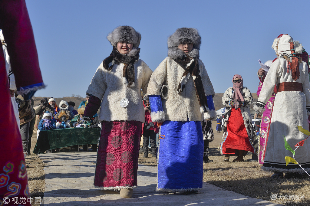 2018年12月29日,內(nèi)蒙古錫林郭勒盟。當(dāng)日,在正藍(lán)旗的草原上,牧民們輪流展示著自制的富有民族特色的冬裝。