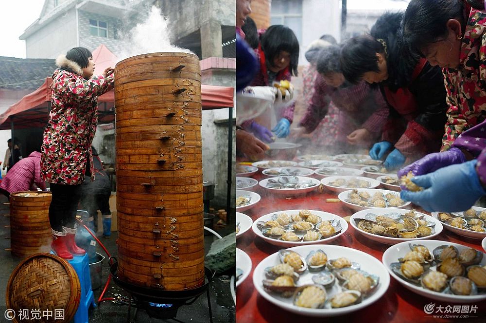 2019年1月1日,杭州建德壽昌鎮(zhèn)一農(nóng)家院內(nèi)張貼著大紅喜字,整個(gè)院落喜氣洋洋,廚房里飄出誘人的美食香味。孩子們奔來跑去,不時(shí)叫喊“新娘來啦”,一場豐盛的喜宴正在進(jìn)行中。院中疊放著蒸籠,高達(dá)2米,散發(fā)出熱氣騰騰的海鮮味,鄉(xiāng)村大廚站在凳上、踮著腳尖察看籠中食品是否熟透。(拼接圖片)