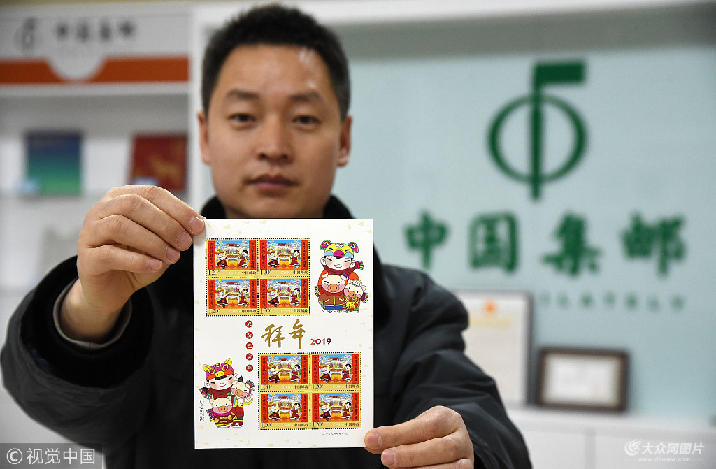 2019年1月10日,中國郵政集團公司河北邯鄲市分公司的工作人員展示《拜年》特種郵票小版票。