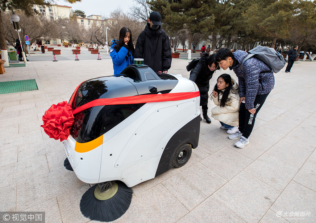 2019年1月9日,呼和浩特,無人駕駛清掃車“蝸小白”在內(nèi)蒙古師范大學(xué)校園內(nèi)進(jìn)行清掃作業(yè)。