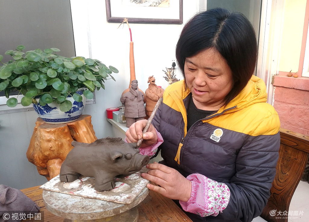 2019年1月7日,青島,平度市東閣街道大十里堡民間藝人王小妮在創(chuàng)作小豬題材的泥塑作品。