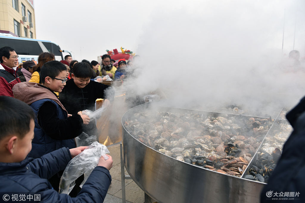 2019年1月12日,游客在山東省乳山市海陽所鎮(zhèn)德泰銀海商貿(mào)城圍觀熱氣騰騰的“大鍋海鮮”,準(zhǔn)備免費(fèi)品嘗牡蠣盛宴。