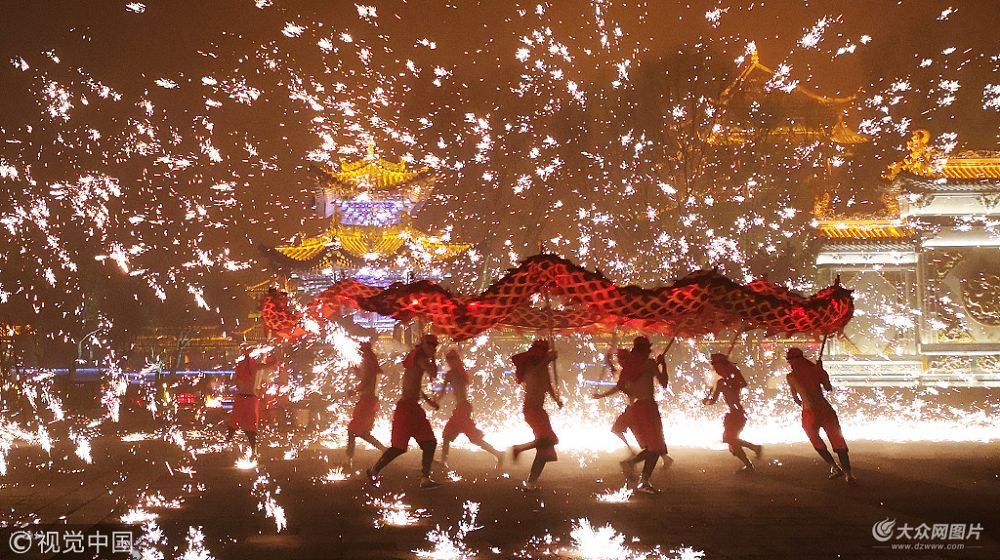 2019年1月13日,山東棗莊,臺兒莊古城“年味”大戲持續(xù)上演,“火龍鋼花”、百獅賀歲、社火巡游等非物質(zhì)文化遺產(chǎn)表演輪番上演,精彩紛呈,為市民和游客獻上精彩的“文化大餐”。