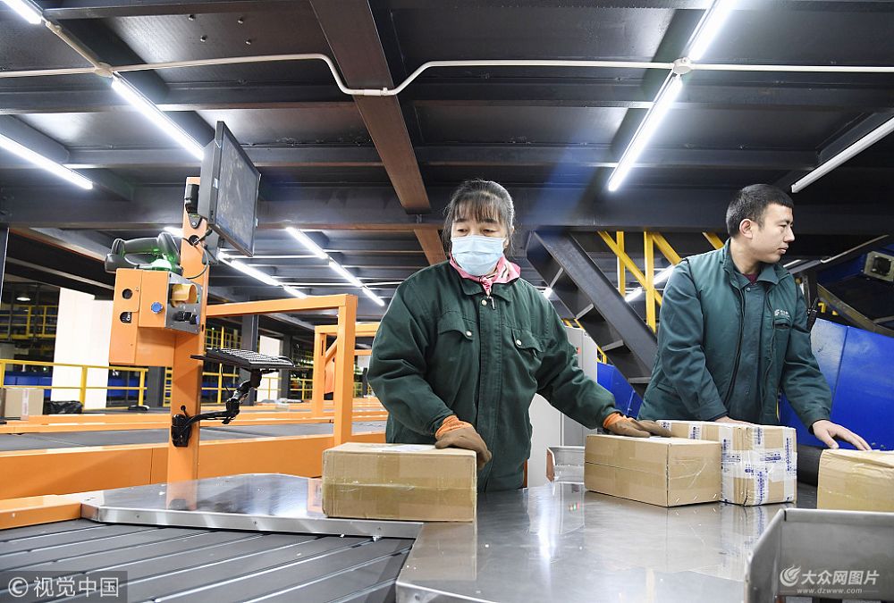 2019年1月16日,山東濟南,濟南郵區(qū)中心局雙層包裹自動分揀機正在分揀包裹。