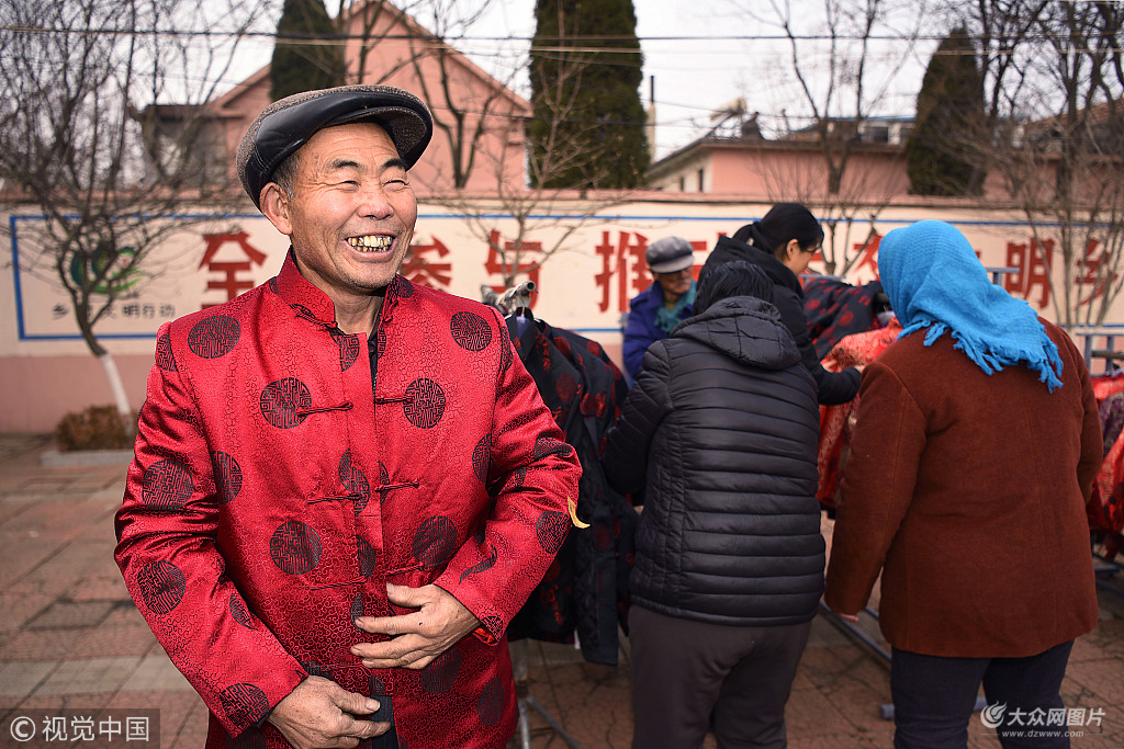 2018年1月19日,山東省日照市日照經(jīng)濟(jì)技術(shù)開發(fā)區(qū)北京路街道車家村村委大院,62歲的孫開社在試穿唐裝。喜悅的表情像個(gè)盼年的孩子。