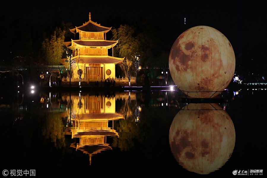 2019年1月25日,云南省昆明市,一個直徑8米、高12米的巨型“月亮”亮相昆明大觀公園新春燈展,形成“月映名樓”的獨(dú)特景觀。