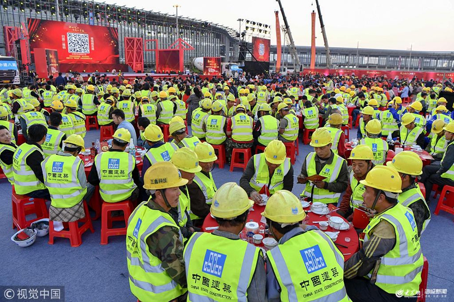 2019年1月25日晚,2019年海南農(nóng)民工年夜飯暨2018年度“最美農(nóng)民工”表彰晚會在中建八局承建的?诿捞m國際機場二期工程T2航站樓前舉行。