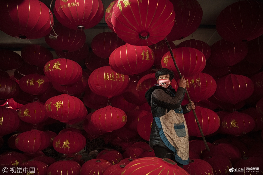 2019年1月24日,河北屯頭村,當?shù)毓と粟s制燈籠迎新春。農(nóng)歷新年臨近,燈籠迎來銷售旺季。河北省石家莊市藁城區(qū)被譽為“宮燈之鄉(xiāng)”,有“中國宮燈第一村”之稱的梅花鎮(zhèn)屯頭村則是藁城宮燈的主要生產(chǎn)集中地。
