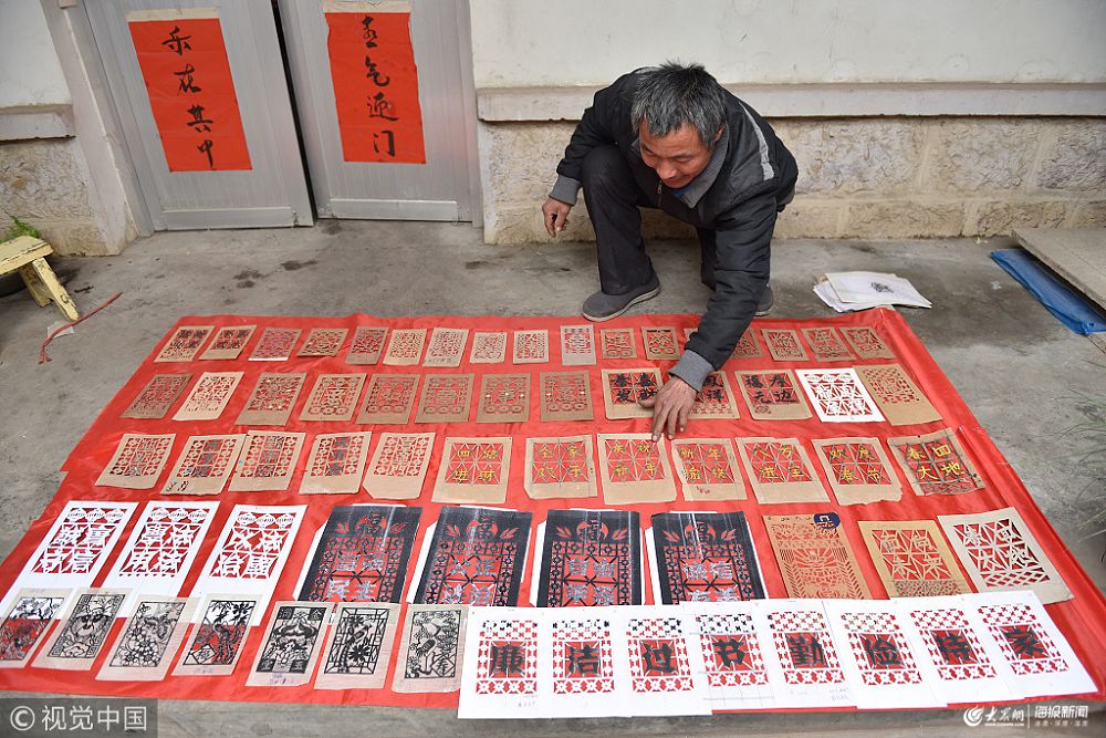 2019年1月30日,山東日照,今年53歲的史龍江是莒縣閻莊鎮(zhèn)大柏林村村民,同時他也是莒縣“過門箋”市級非物質(zhì)文化遺產(chǎn)代表性傳承人之一。他從19歲開始自立門戶制作“過門箋”,至今已經(jīng)堅守這門手藝34年。