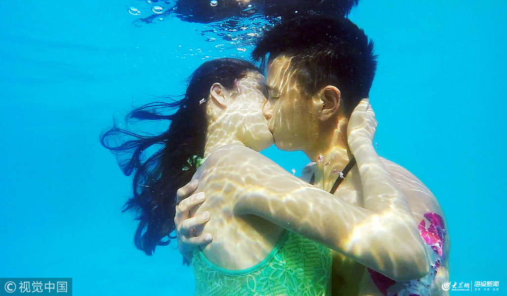 2015年08月02日,武漢市,11對(duì)身著清涼泳裝的情侶在水中展開(kāi)火辣的接吻大賽,最終一對(duì)結(jié)婚11年的夫妻以1分02秒的成績(jī)奪得冠軍。