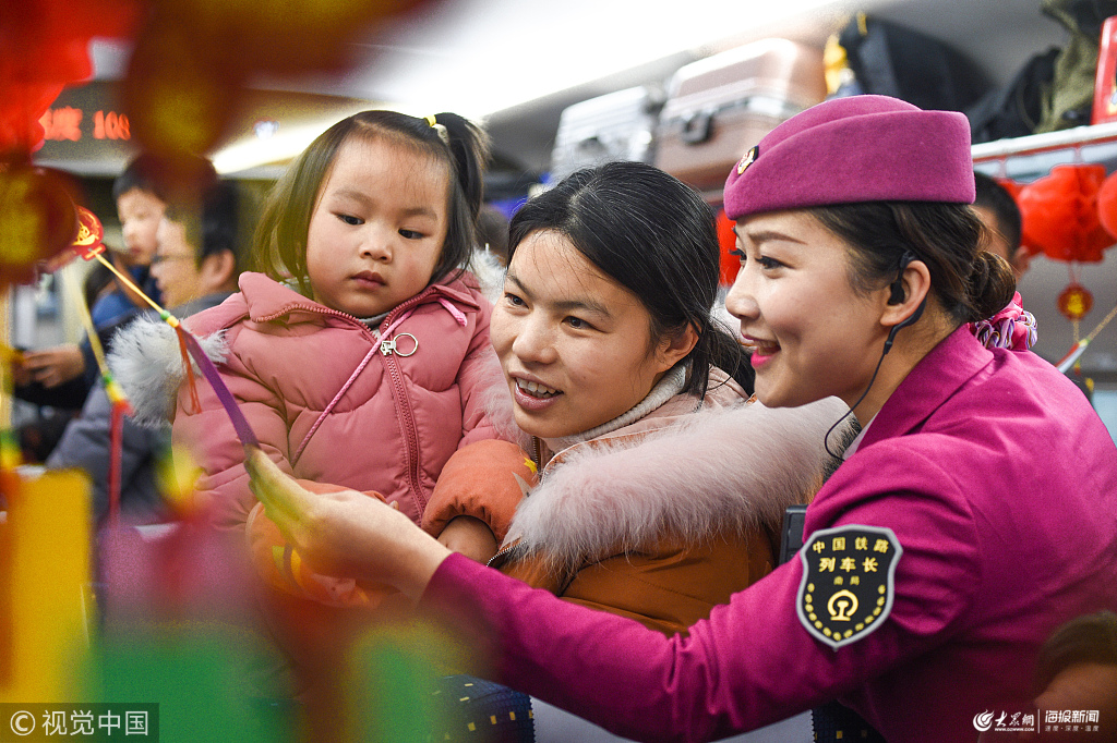 2019年2月11日,在南昌至杭州東G1462次列車上,大人和孩子們饒有興致的猜燈謎。