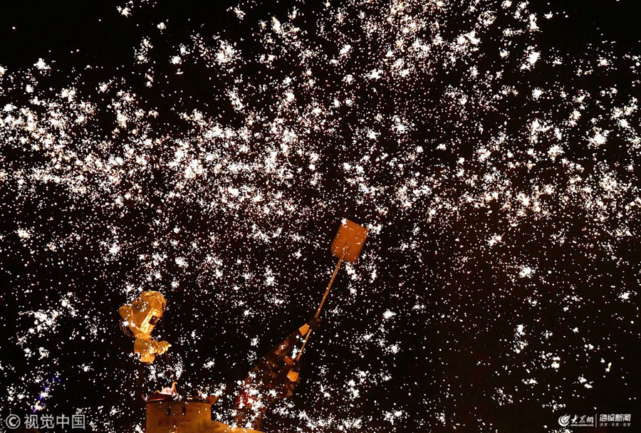 2019年2月17日,元宵節(jié)將至,山東煙臺(tái)各大公園景區(qū)張燈結(jié)彩,民俗展演精彩紛呈,人們?cè)跉g樂(lè)喜慶的節(jié)日氛圍里迎接元宵佳節(jié)的到來(lái)。2019年2月17日,在山東省煙臺(tái)市塔山旅游風(fēng)景區(qū),民間藝人在打鐵花。