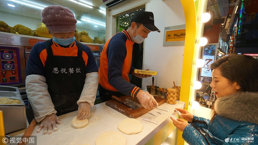 2019年2月18日,山東臨沂,在蘭山區(qū)美食街內(nèi)有一家十分火爆的“榴蓮芝士餅店”,據(jù)臨沂本地人說他家的榴蓮餅是最正宗的。