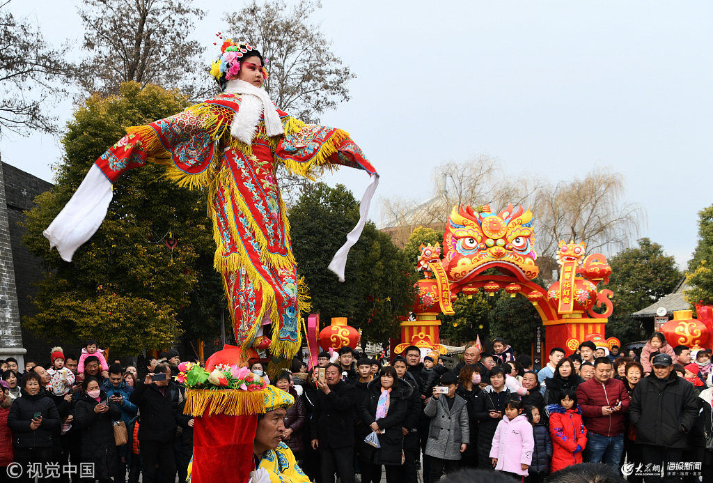 2019年2月17日,山東棗莊,民間藝人在臺兒莊古城景區(qū)表演“背閣”。