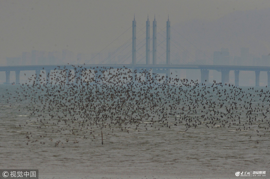 2019年2月26日,青島膠州灣國(guó)家海洋公園,“鳥(niǎo)潮”景觀(guān)。