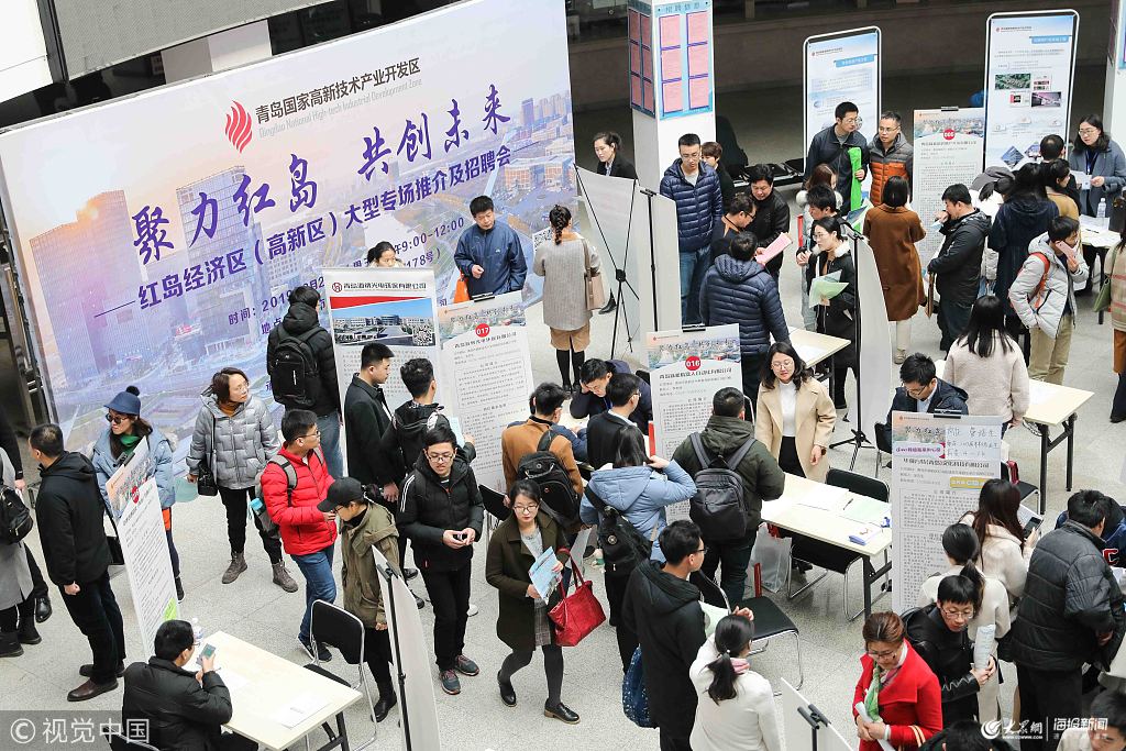 2019年2月27日,求職者在2019青島市紅島經(jīng)濟(jì)區(qū)(高新區(qū))大型專場推介及招聘會上查看招聘信息。