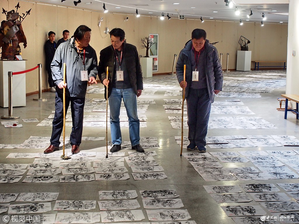 2019年2月28日,濟南,圖書館的地面上數(shù)千份素描試卷平展地攤開,由專家教授組成的評委小組逐幅考卷仔細端詳,進行分類歸檔以及復核,將試卷按照藝術水平分組打分。