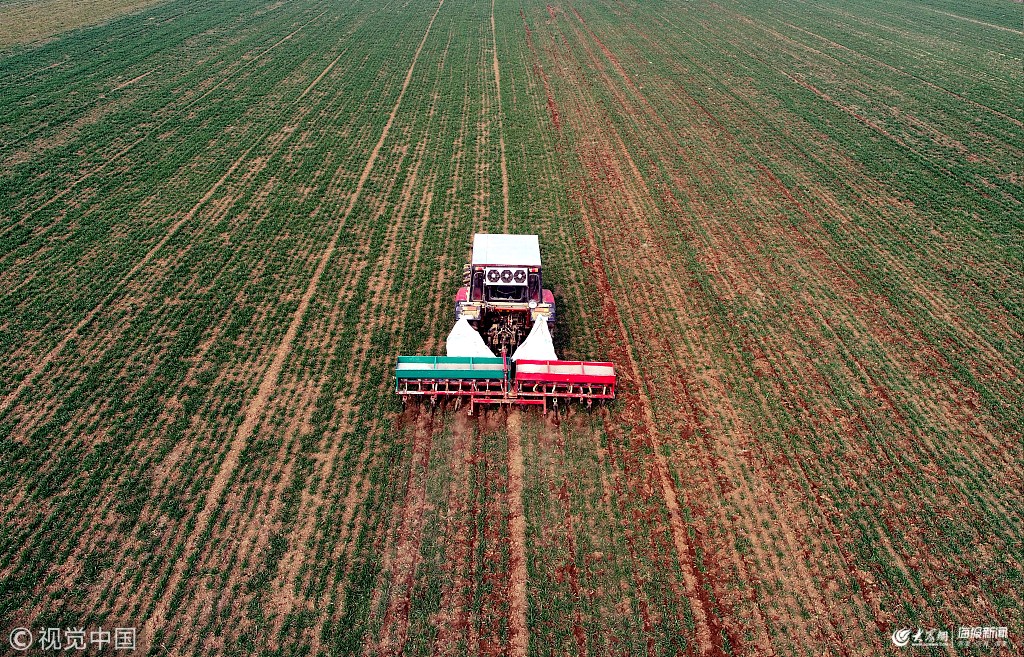 2019年2月28日,早春時(shí)節(jié),山東省臨沂市郯城縣農(nóng)民忙著加強(qiáng)麥田管理,追施小麥返青肥,為夏糧豐收打基礎(chǔ)。
