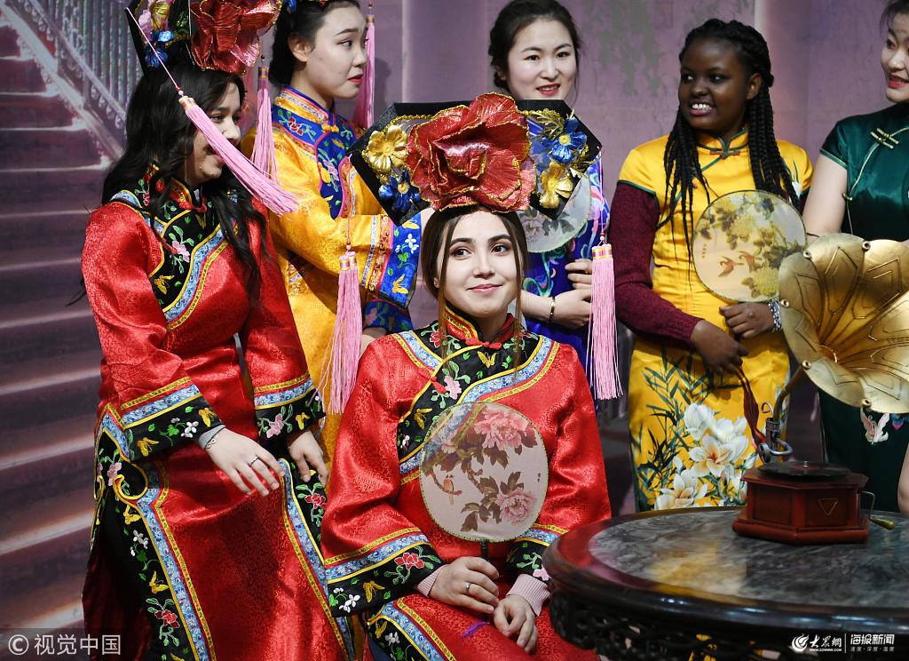 2019年3月8日,在吉林長(zhǎng)春偽滿皇宮博物院,來(lái)自異國(guó)的留學(xué)生們身穿旗袍、滿族民族服裝,感受中國(guó)女性傳統(tǒng)服飾的魅力。 張瑤(吉林分社)/中新社/視覺(jué)中國(guó)