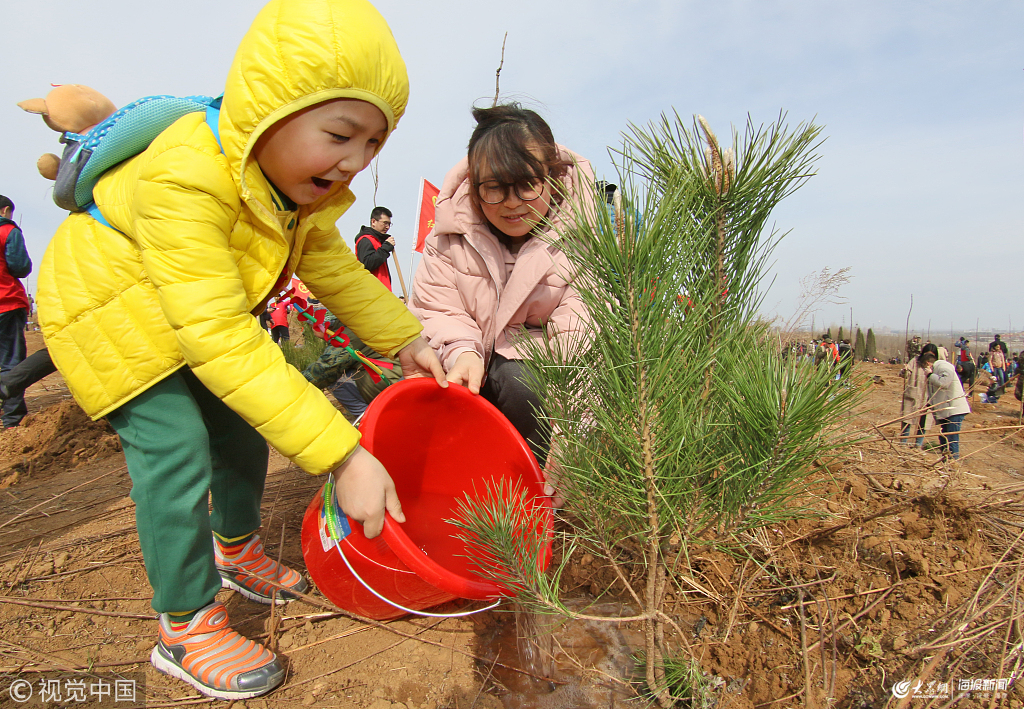 2019年3月9日,一對母女在山東省煙臺市牟平區(qū)海德動植園植樹。