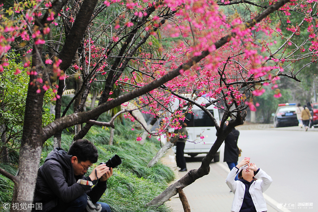 2019年3月9日,在武漢大學校醫(yī)院旁的珞珈山畔,早櫻迎春綻放,吸引了不少市民和攝影愛好者前來觀賞、拍照。