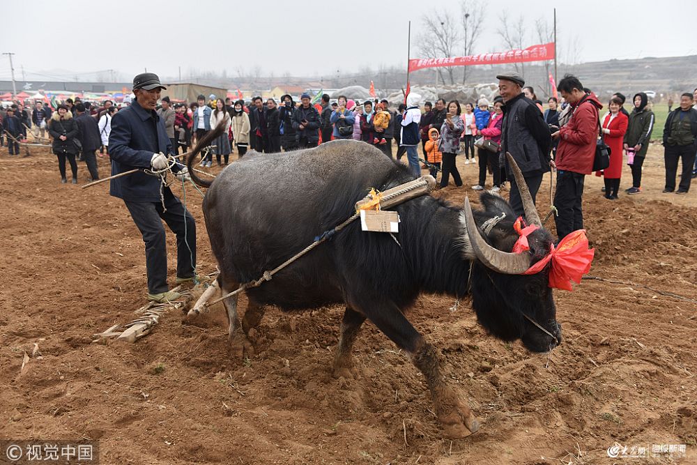 2019年3月9日,山東日照,嵐山區(qū)黃墩鎮(zhèn)上雙疃村,76歲的莊會(huì)福正在使牛參加民俗活動(dòng)“鬧春!备乇荣悺狒[的現(xiàn)場(chǎng)吸引了近千人圍觀,有人專門開車跑幾十公里前來觀看。