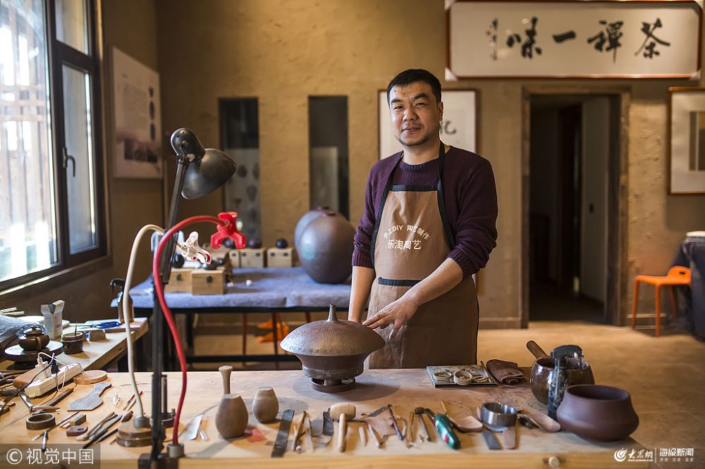 2019年3月13日,山東濱州。今年36歲的王超因?yàn)橄矏?ài)陶瓷和紫砂壺,不顧家人的反對(duì),放棄工作專職從事陶瓷和紫砂壺的制作。王超用時(shí)5個(gè)月創(chuàng)作了兩個(gè)中華基因紫砂瓶,刻繪了可識(shí)讀的甲骨文字2606個(gè)。