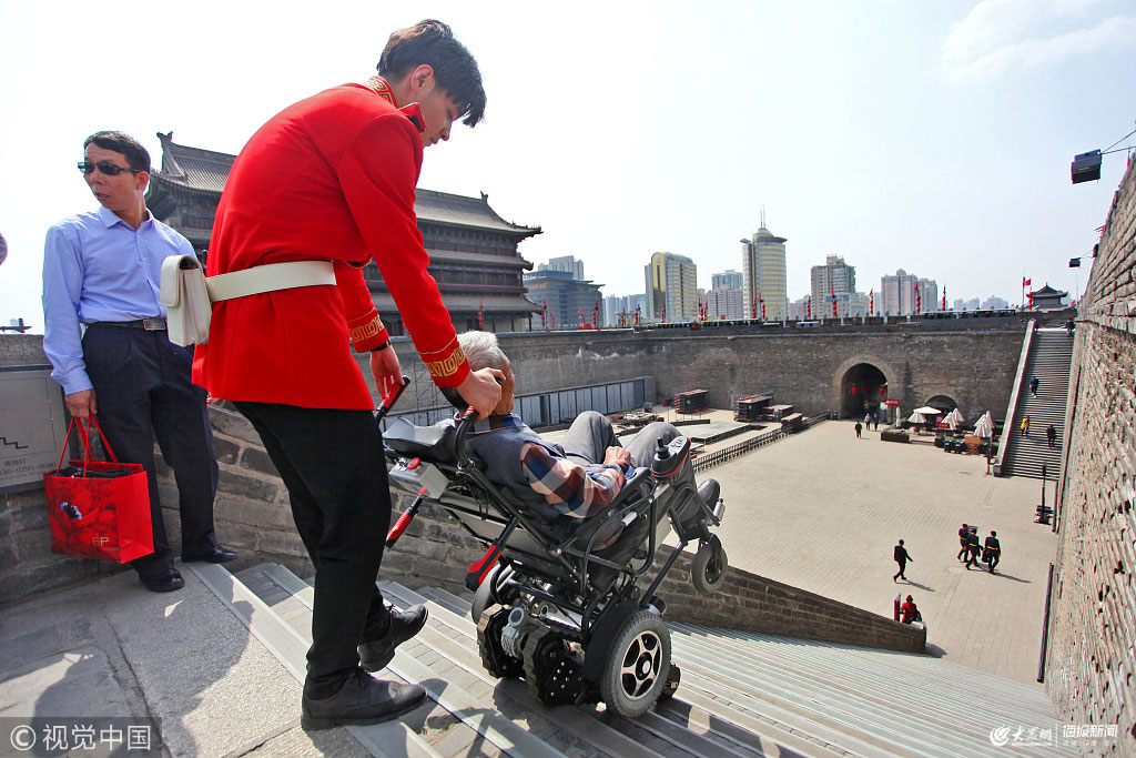 為了方便老年人和腿腳不便的游客,西安城墻南門入口專門配備了一臺“爬樓機(jī)”,幫助游客上下臺階,引來不少游客點(diǎn)贊。3月20日,在西安城墻南門登城處,來自黑龍江84歲張大爺就體驗(yàn)了一把“爬樓機(jī)”,因?yàn)椴挥脼榕罉翘莘鸽y,張大爺輕松登上視野開闊的古城墻,眺望遠(yuǎn)處的美景老人心情特別舒展。