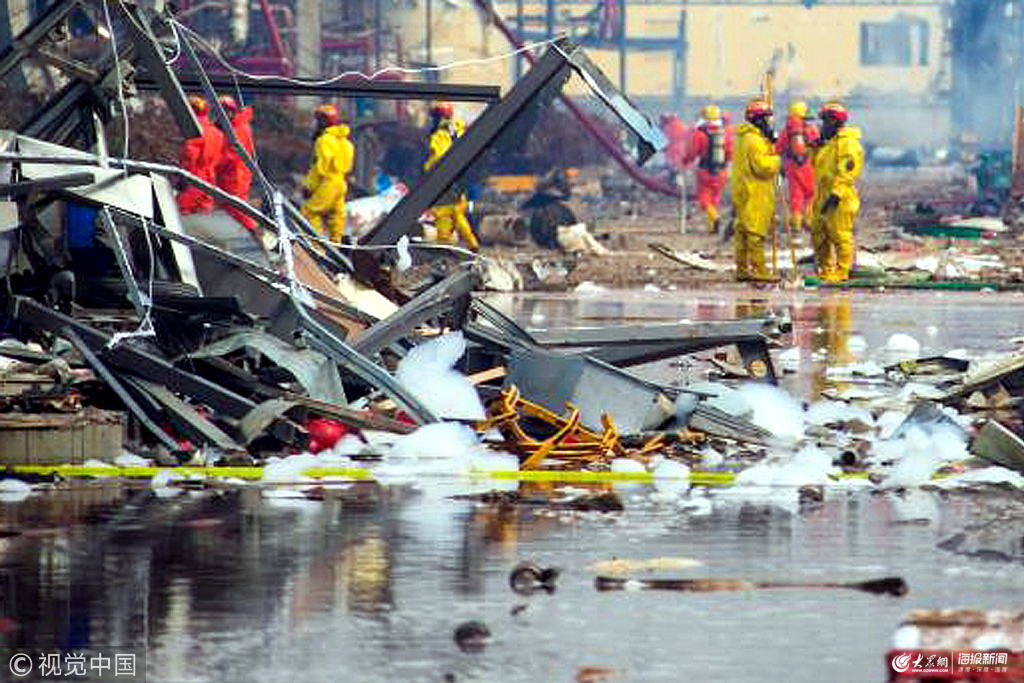 2019年3月23日上午8時30分許,江蘇鹽城,在響水縣陳家港化工園區(qū),身穿防化服的消防員們攜帶專業(yè)救援設(shè)備,穿梭于爆炸現(xiàn)場和周邊廠區(qū)。