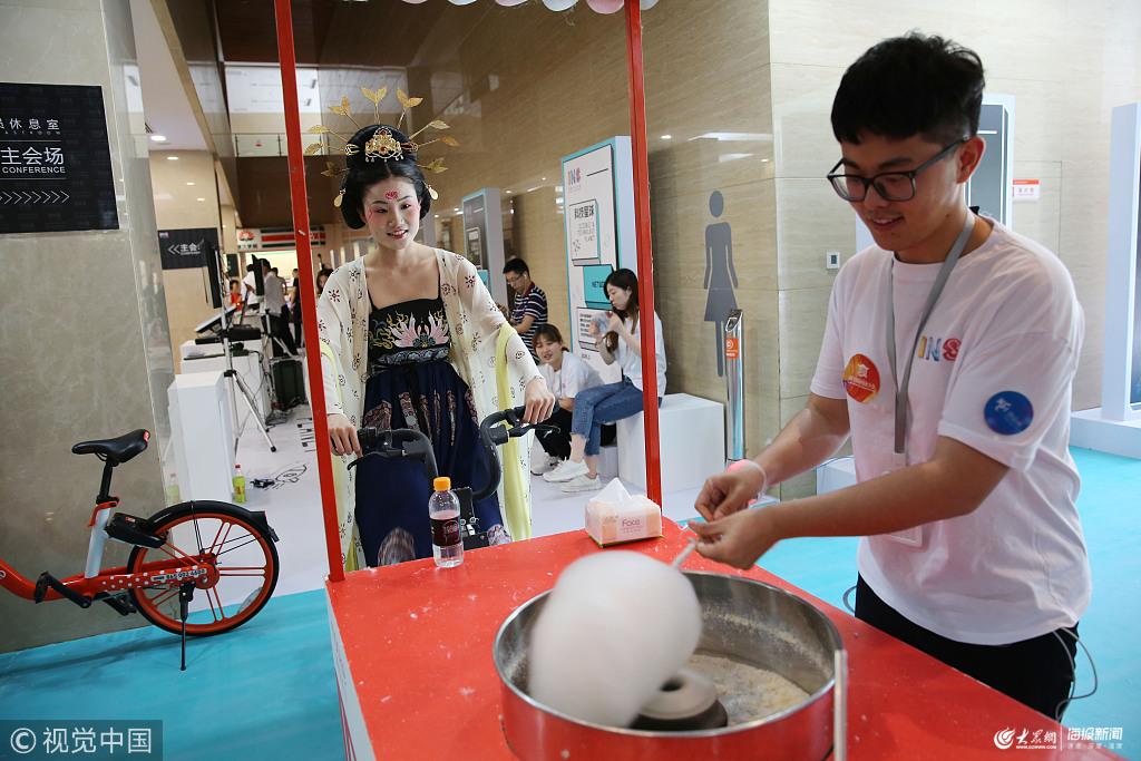 2018年5月22日,2018全球INS大會登陸西安,唐朝妹妹踩著共享單車發(fā)電,小伙用竹簽卷著,不一會就做出一個棉花糖。