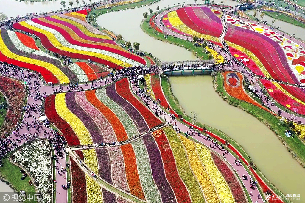 2019年4月6日,江蘇鹽城市大豐荷蘭花海的300萬株郁金香隨風(fēng)盛開,吸引了眾多市民和游客前來觀賞。從空中看,一片片彩色的郁金香花田仿佛巨幅彩帶,將數(shù)百畝花海裝扮得分外美麗。