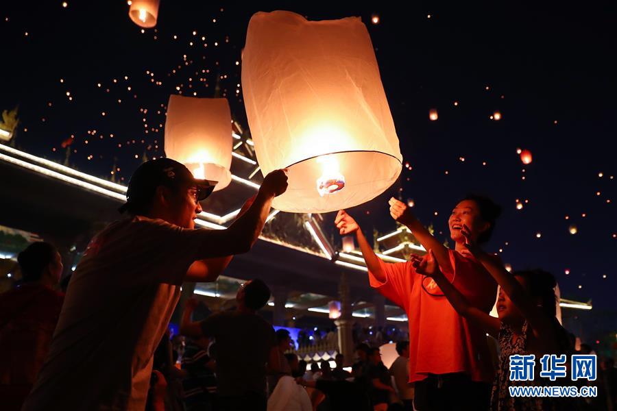4月13日晚,人們在西雙版納的瀾滄江畔放飛孔明燈。當日,為期3天的云南省西雙版納傣族自治州潑水節(jié)舉行。節(jié)日期間,當?shù)貙⑴e辦劃龍舟比賽、燃放孔明燈、潑水狂歡等活動,慶祝傣歷新年。 新華社記者 張玉薇 攝