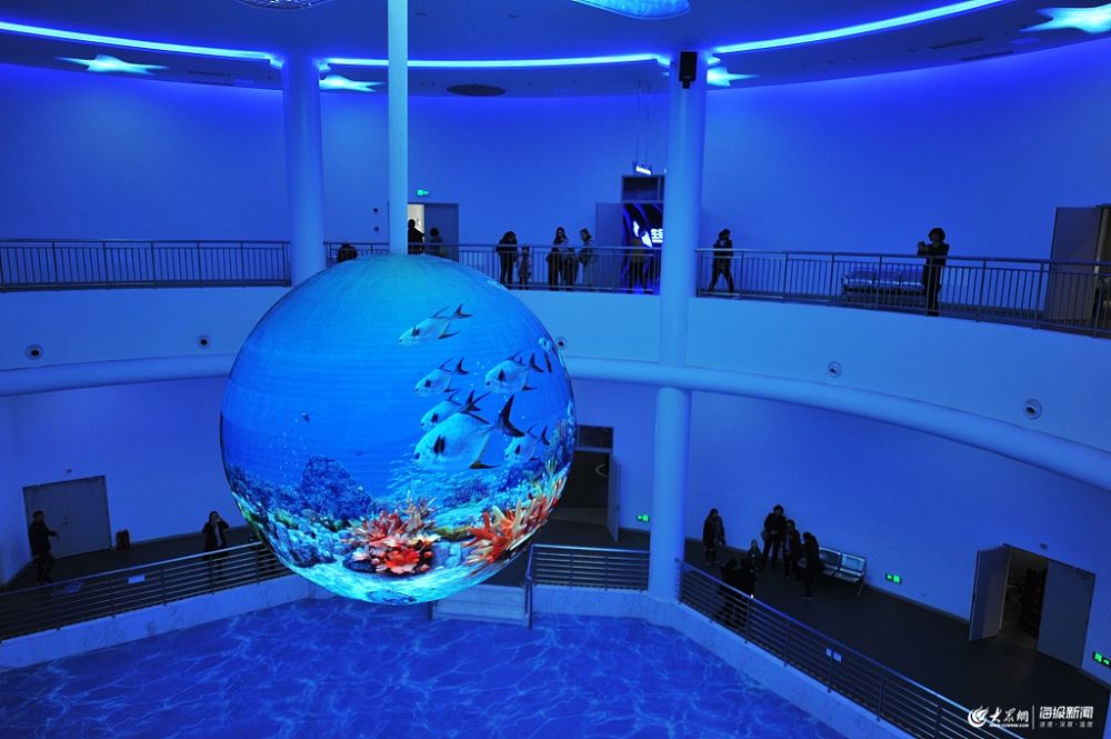 日照海洋科普館經(jīng)試運(yùn)行一年后于4月26日正式向游人開放。據(jù)了解,該館占地3萬平方米,共設(shè)128個展品展項(xiàng),通過AR、4D、生物標(biāo)本、模型、互動體驗(yàn)及海洋科普教育等方式,讓人們進(jìn)一步認(rèn)識大海,了解海洋知識。2019年4月28日,游客在日照海洋科普館海底世界立體球展廳參觀。
