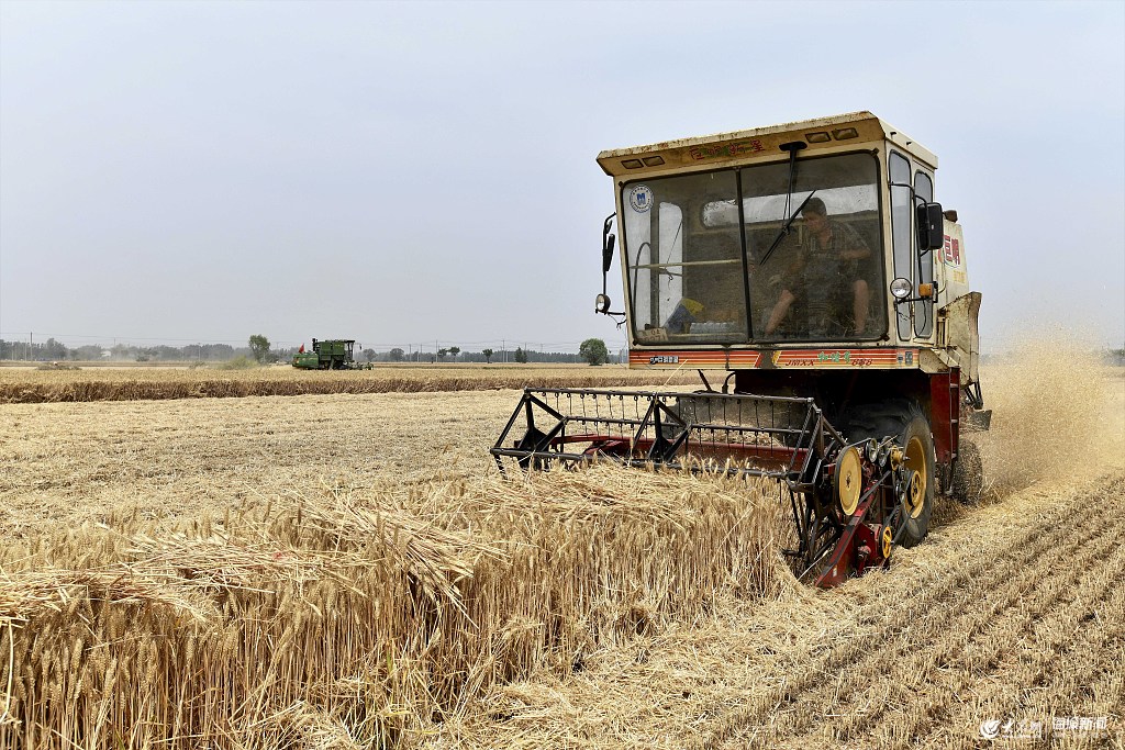2019年6月5日,山東棗莊。魯南小麥大面積開(kāi)始進(jìn)入收獲期,當(dāng)?shù)剞r(nóng)民搶抓農(nóng)時(shí)開(kāi)展夏收作業(yè),金黃的麥田里一派繁忙景象。