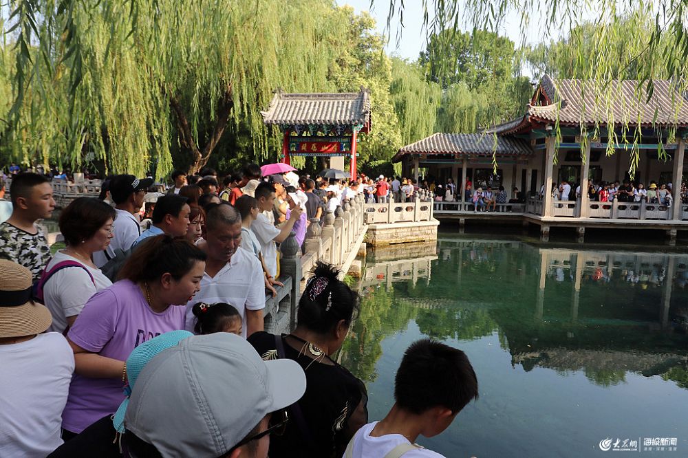 2019年6月8日,濟南,端午假期,趵突泉景區(qū)內(nèi)游客扎堆,游客在樹蔭、涼亭、水池邊納涼玩水賞景。