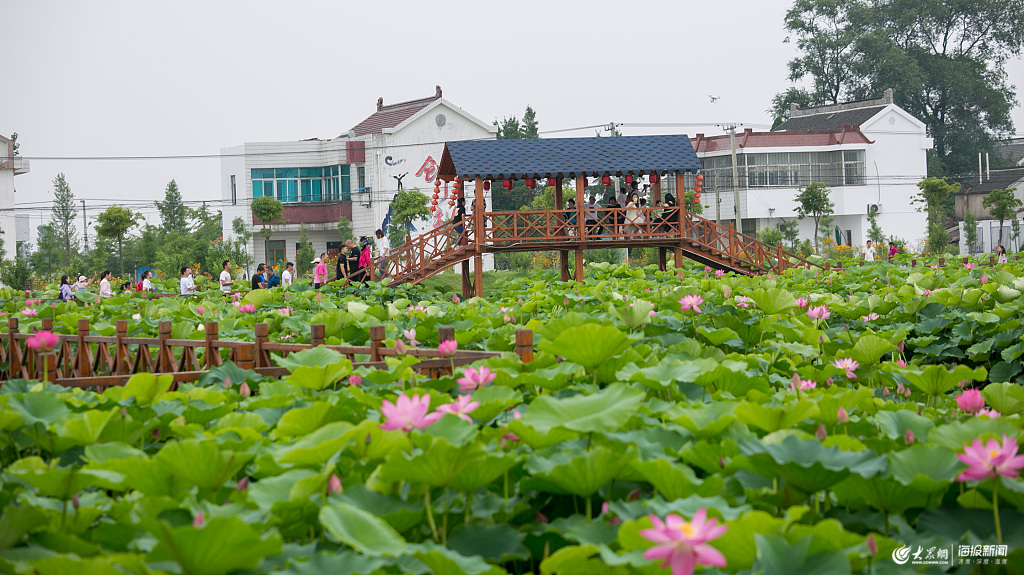 2019年6月22日,游客在江蘇南通如皋經(jīng)濟(jì)技術(shù)開發(fā)區(qū)平園池村千畝荷塘賞花游玩。