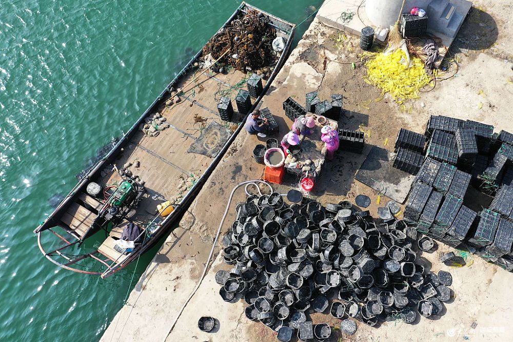 2019年6月26日,山東威海,榮成市一碼頭,漁民在剝離、挑選鮑魚苗(無人機拍攝)。