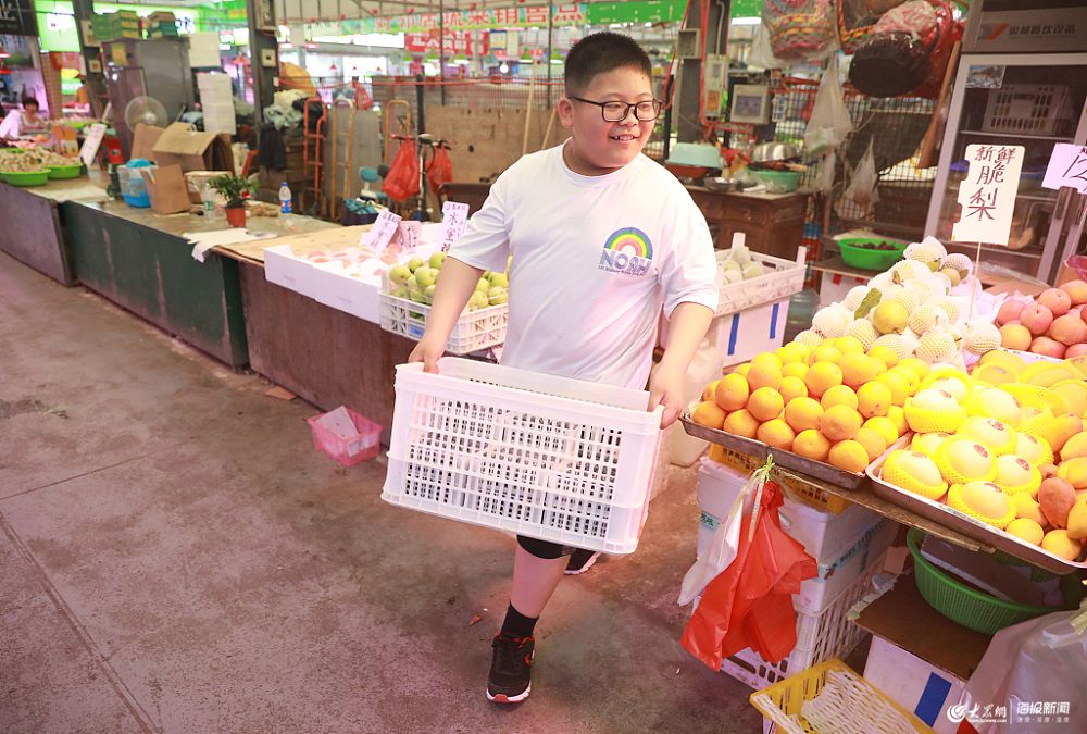暑假當(dāng)起小當(dāng)家 青島一男孩幫著父母照看水果攤