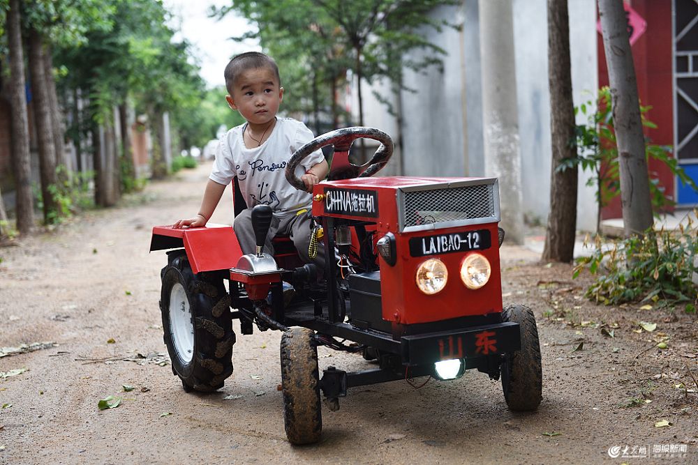 2019年7月7日,在山東省日照經(jīng)濟(jì)技術(shù)開發(fā)區(qū)奎山街道西河村,村民宋成軍造了一輛“迷你拖拉機(jī)”一時(shí)成為村里的新鮮事,每當(dāng)他的兒子開著這輛“迷你拖拉機(jī)”上街玩耍時(shí),都會吸引人們的圍觀。宋成軍說:“回頭率百分之百!
