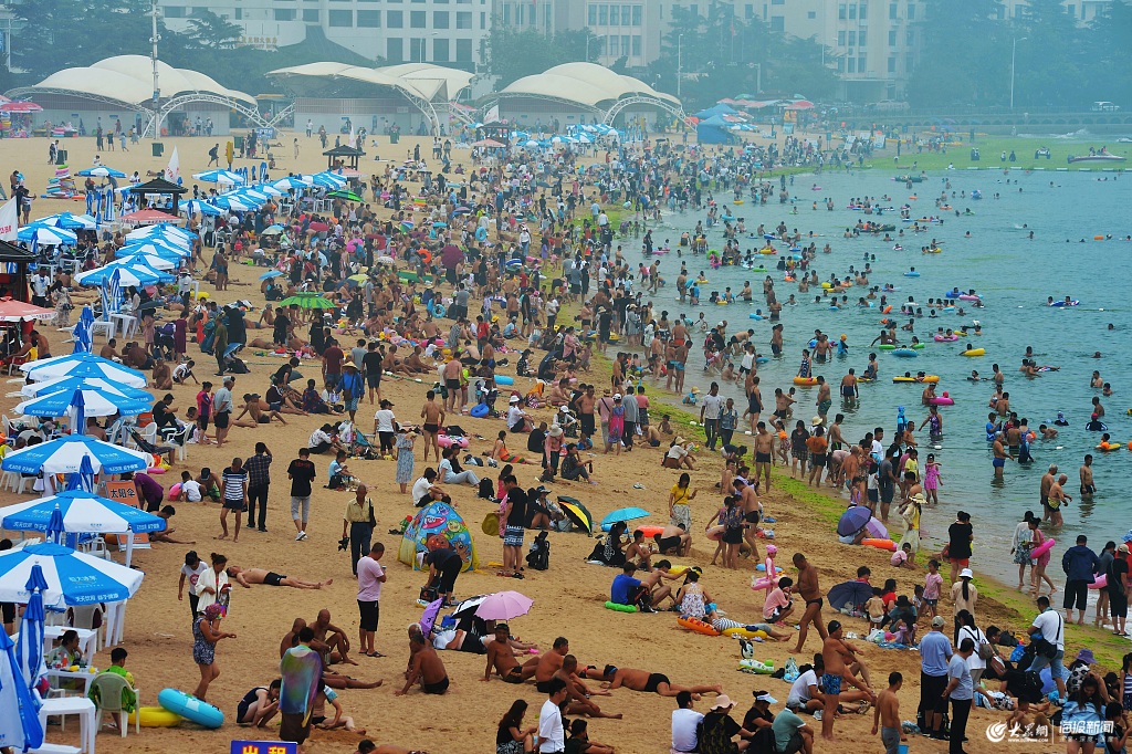 2019年7月12日,青島,游客在第一海水浴場(chǎng)洗海澡。當(dāng)日是農(nóng)歷六月初十,入伏日,青島第一海水浴場(chǎng)人山人海,大批市民游客前來(lái)洗海澡戲水消暑,享受大海清涼。